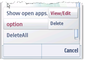 For example, the following illustrations show how the item-specific submenu item (Delete) is hidden in the options menu and displayed in the stylus pop-up menu by setting the EEikMenuItemSpecific flag.
