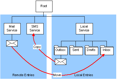 Folders and messages under the local service represent messages stored on the device. Folders and messages under remote services represent a local copy of messages that are present on a remote server. For example, under a POP3 email service you can have copies of all the messages present on the POP3 email server, and under an SMS service you can have SMS messages that are stored on a SIM.