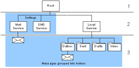 Message Framework provides a tree view of entries in a Message Store. The tree is divided into three levels: root entry, service entry, and folder and message entry, which are provided TMsvEntry. The child entries of the root entry must be service entries. A message client application can begin from the root entry, and by successively finding the children of an entry, can traverse the whole entry tree. The parent of each entry is recorded in the index entry's details.