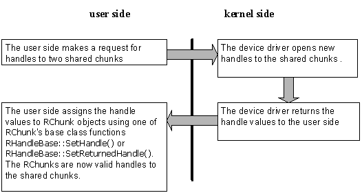 If the creation of the handle is successful, the device driver returns the handle value back to the user-side. The user-side code then assigns the value to an RChunk object using one of RChunk's base class functions: