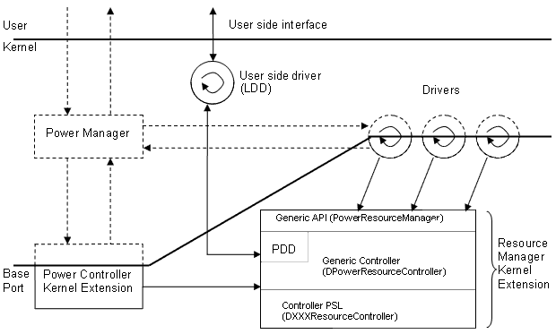 The Power Resource Manager component is implemented as a kernel extension. It has an exported public interface accessible to kernel-side components. Kernel components link to the resource manager kernel extension DLL (resman.lib). Extended features are compiled and exported in an additional library (resmanextended.lib). The export library is built from the generic layer.