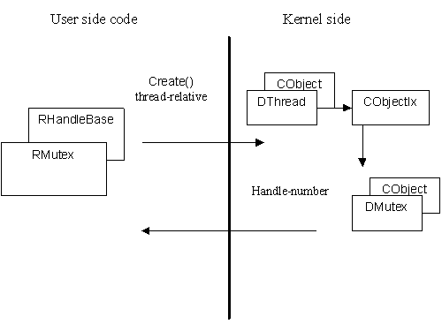 For example, RMutex is the handle for a mutex; all user side interaction with a specific mutex is directed through an instance of RMutex. The RMutex object exists on the user side; the corresponding mutex (a DMutex object) exists on the Kernel side.