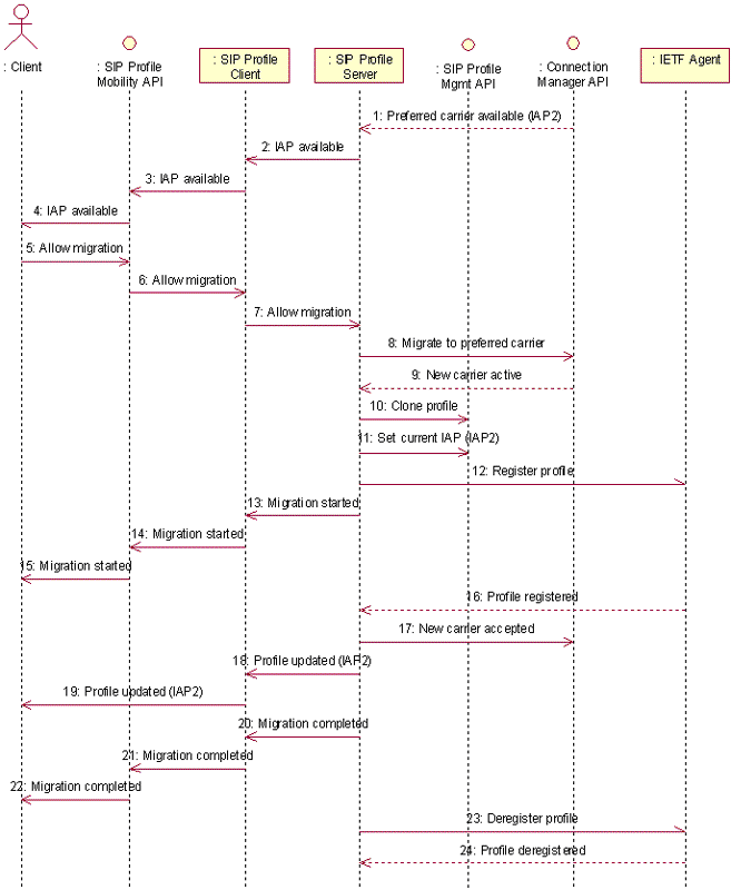 To register for ALR events, use an instance of the CSipProfileAlrController class and implement the MSipProfileAlrObserver interface to register for ALR events. When registered for the ALR event, the MSipProfileAlrObserver interface notifies the client when a SIP profile used by the client tries to migrate to another IAP. Then the client can allow or disallow the migration request using the CSipProfileAlrController::AllowMigrationL() or CSipProfileAlrController::DisallowMigrationL() functions.