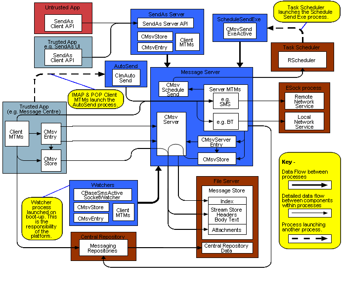 The following figure shows the processes and data flow in the Messaging subsystem on a secured Symbian platform.