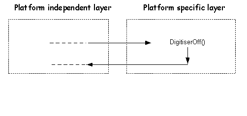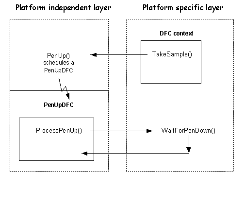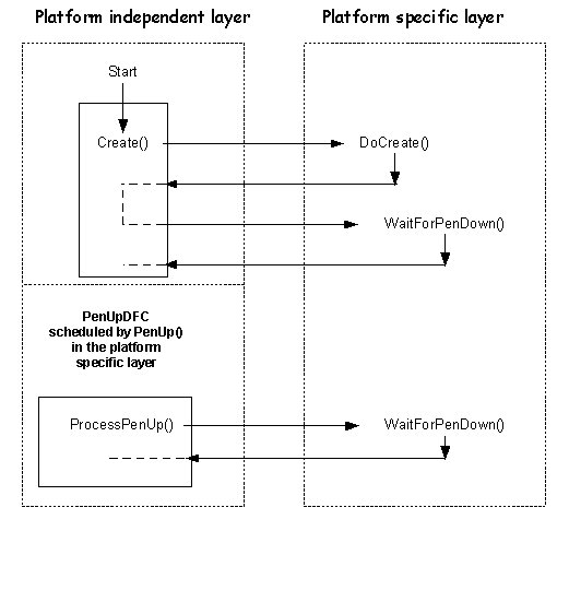 The platform independent layer then calls the function WaitForPenDown(). This is declared as pure virtual in the DDigitiser class and is implemented in the platform specific layer. This function is also called from the ProcessPenUp() function that runs in a DFC thread scheduled to run when the pen is lifted. This DFC is scheduled in the platform specific layer.