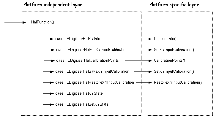 The platform independent layer provides the HAL handler for the EHalGroupDigitiser HAL groups and function-ids. This is DDigitiser::HalFunction(). It delegates the handling of 5 of the individual behaviours, as represented by the TDigitiserHalFunction function-ids, to the following functions, declared as pure virtual in the DDigitiser class, and implemented by the platform specific layer: