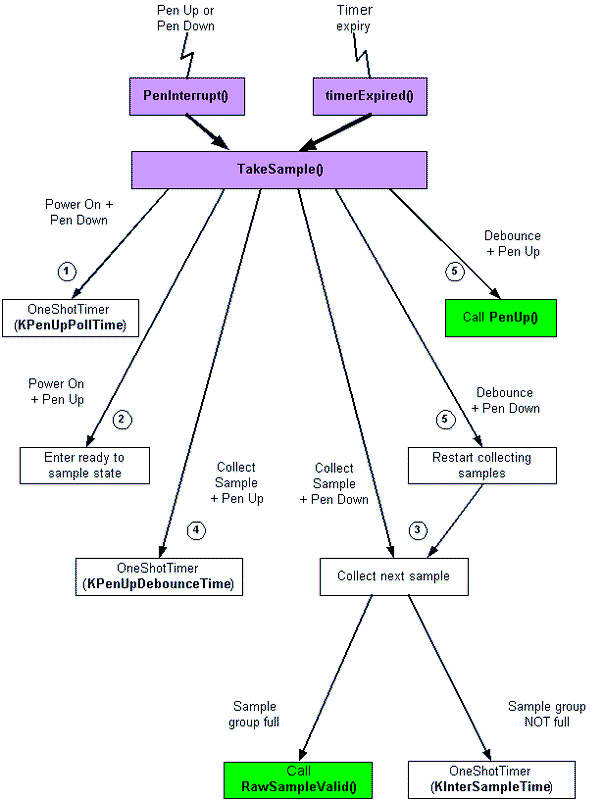 The platform specific layer calls RawSampleValid() when it has a group of digitizer coordinates ready to be processed by the platform independent layer. This is called in the context of a DFC thread, the DFC being queued when the digitizer interrupt is fired.