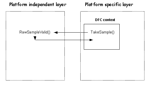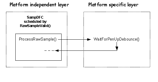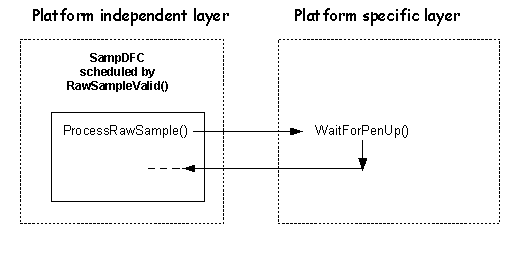 The heart of the design is a DFC that reads digitizer data samples when the pen goes down, and then samples the digitizer at regular intervals until the pen goes up. These samples are accumulated in a buffer in the platform independent layer. When enough samples have been gathered, the platform independent layer averages them, processes them, and issues pen movement events.