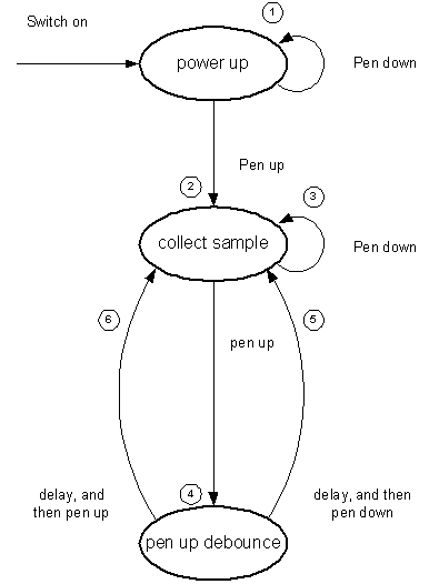 If the pen is lifted while in the collect sample state, then the state changes to the pen up debounce state. This state describes the situation where a pen is lifted from the device and there is uncertainty as to whether this represents a positive move by the user, or whether the pen pressure has just been reduced momentarily. A delay is scheduled to decide to see which is case is true. At the end of the interval the state of the pen is checked again. If the pen is found to be down at the end of this interval, then the state changes back to the collect sample state, and the sample buffer is reset.