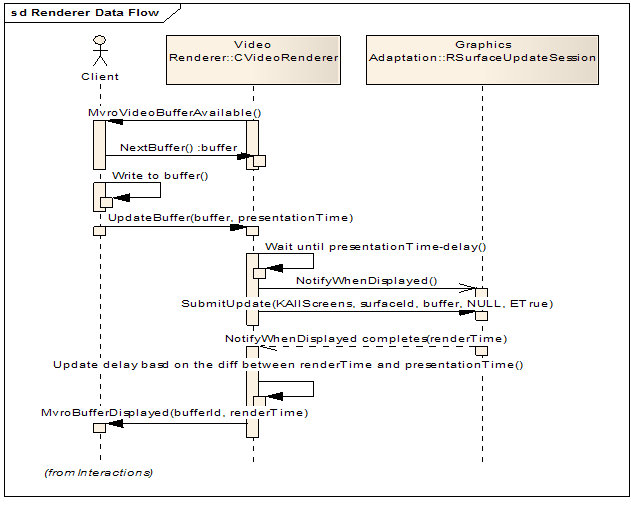 The Video Renderer uses the global constant KAllScreens (provided by the Surface Update component) to ensure all displays are updated with new data. The following sequence diagram shows the Video Renderer passing KAllScreens in the call to RSurfaceUpdateSession::SubmitUpdate():