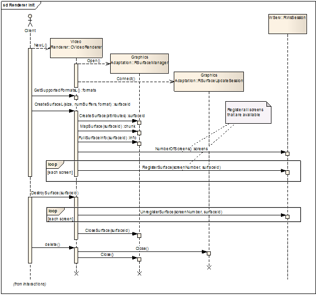 The Video Renderer registers and unregisters surfaces with the Window Server for all available displays. When the client calls CVideoRenderer::CreateSurfaceL(), the Video Renderer creates the surface and then registers it with each display. When the client calls CVideoRenderer::DestroySurfaceL(), the Video Renderer unregisters the surface with each display and then destroys it. The following sequence diagram shows how the Video Renderer registers and unregisters surfaces: