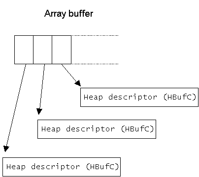 When a descriptor is added to this type of array, a heap descriptor is allocated, taking its data from the supplied descriptor. The pointer to this heap descriptor is added as an array element. The following diagram illustrates this. The diagram is also true for HBufC8 and HBufC16.
