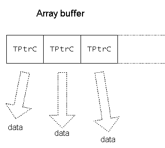 The elements of this type of array consist of non-modifiable pointer descriptors. These pointer descriptors represent the data of the descriptors added to the array. The following diagram illustrates this. The diagram is also true for TPtrC8 and TPtrC16.